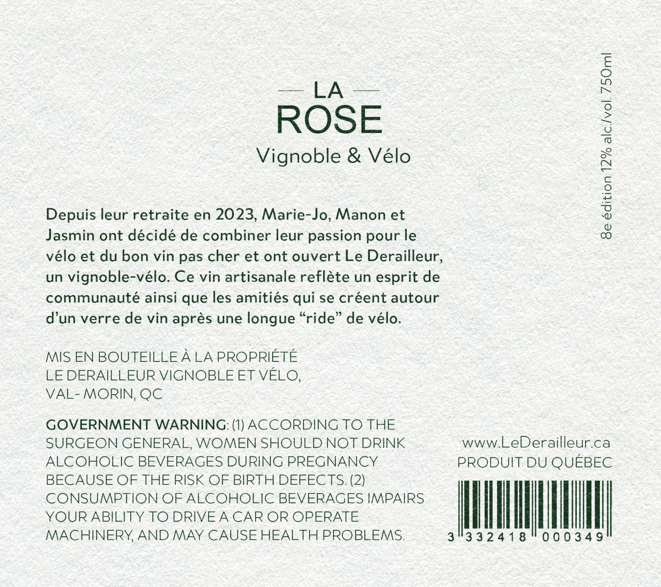 Le Dérailleur, une entreprise fictive basée au Québec, est née du projet de retraite de trois amis passionnés de cyclisme et de vin. Situé à Val-Morin, ce petit magasin de vélos se distingue également par la production et la vente de son propre vin. Le Dérailleur marie de manière unique le monde du cyclisme et l'art de la viticulture.